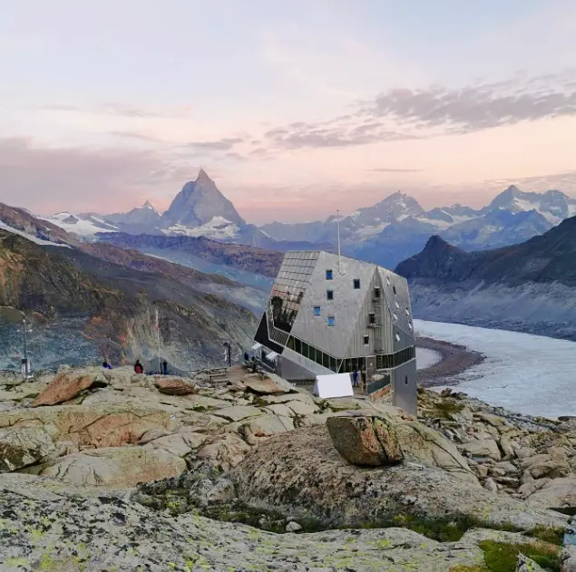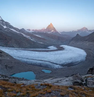 Das Frühstück nehmen wir bei Tagesanbruch und starten anschliessend mit genügend Zeitreserven auf die zweite Etappe. Diese führt über den alten Hütten Weg erst runter. Wir kommen am alten Hüttenstandort vorbei, wo noch das Fundament zu sehen ist und nach einem etwas steileren Abschnitt zu den zwei Gorner Seen. Wer noch nicht wach ist, springt hier kurz ins türkis-blaue Gletscherwasser… Von hier aus führt uns ein Bergweg der grossen Moräne entlang runter zum Eis wo sich eins Grenz- und Gornergletscher vereinten. Über das Eis geht es nun wieder weiter, dann über vo Gletscher abgeschliffenen Felsplatten und an kleinen Gletscherseen vorbei bevor wir nochmals auf Gletscher treffen und über diesen hochsteigen. Hier werden wir die Steigeisen endgültig wegräumen und über dein breites Felsband durch die Rote Felswand hochsteigen mit prächtigem Blick runter auf unsere zurückgelegte Route. Bevor wir jedoch den Wanderweg zum Rotenboden wieder erreichen, passieren wir erst noch die blaue Brücke und steigen über die 15m hoh Leiter hoch. Nun wandern wir in ca. 50min zurück zum Rotenboden und fahren mit der Gornergrat Bahn zurück nach Zermatt.
